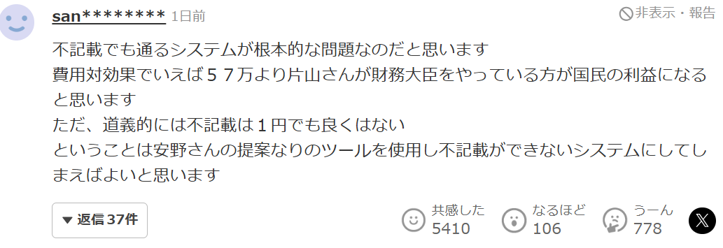 “我认为,真正的根本问题在于'即便存在不记载也能被放过'的制度本身。如果从成本与收益的角度来看,相比那57万日元,让片山继续担任财务大臣,反而更符合国民的整体利益。不过从道义上讲,不记载哪怕只有1日元,也是不可以被正当化的。既然如此,不如干脆采用安野先生提出的方案或相关工具,建立一个从技术层面上“根本无法发生不记载”的系统,这才是治本之道。”