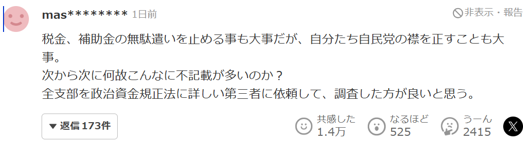 “杜绝税金和补助金的浪费固然重要,但整肃自民党自身的纪律同样重要。为何政治资金没有明确记载的问题会接连不断地被发现?我认为,有必要委托熟悉政治资金规正法的第三方机构,对所有政党支部进行全面调查,才是负责任的做法。”