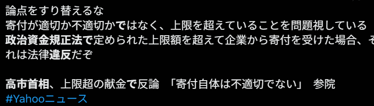“不要偷换论点。现在讨论的不是捐款本身合不合适,而是是否超出了上限。按照《政治资金规正法》的规定,一旦超过法定上限从企业收受捐款,那就是明明白白的违法行为。”