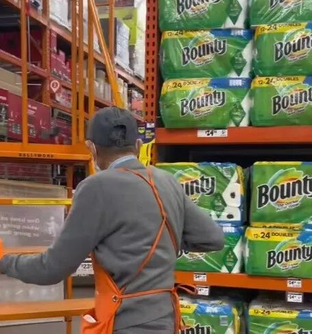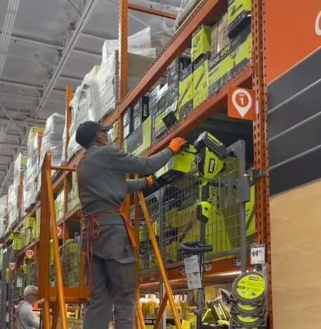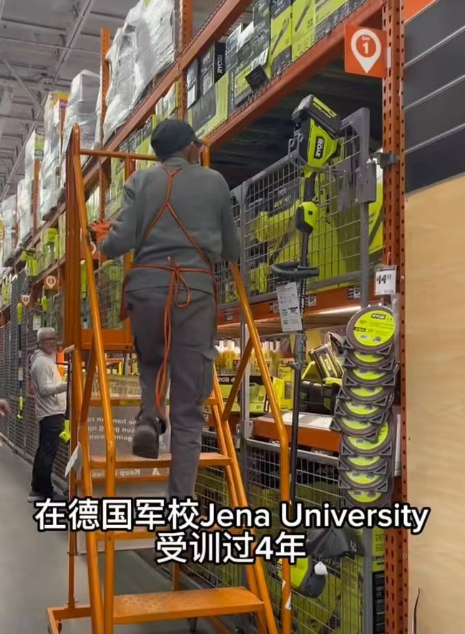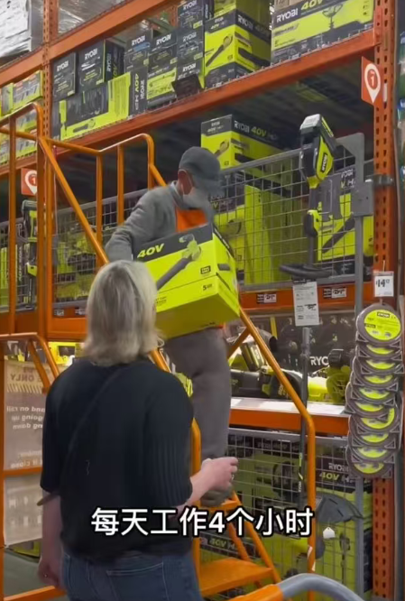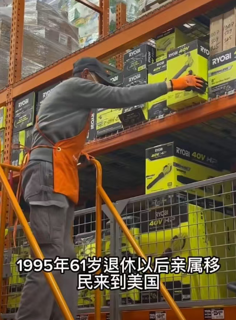 画面里,这位华人老爷爷戴着工作手套,围着 Home Depot 标志性的橘色围裙,站在高高的梯子上,把一台又一台沉甸甸的电动工具往货架上摆。