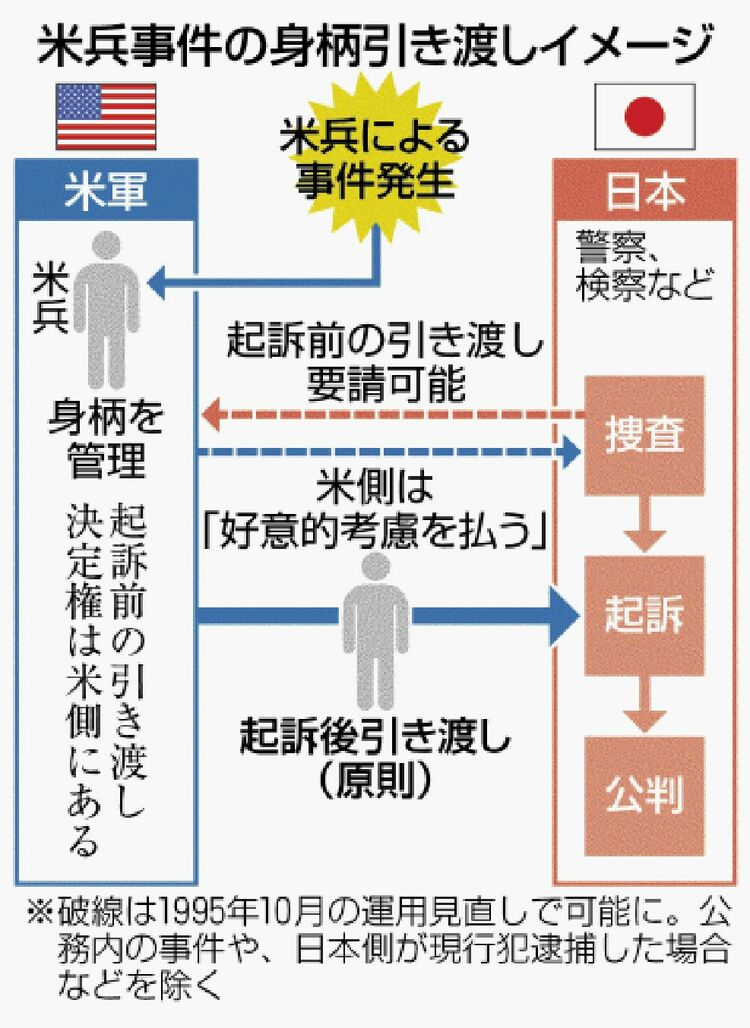 但是,根据《日美地位协定》,在起诉前美军士兵的人身由美军管理,因此冲绳县警和地方检察厅只能通过非强制方式推进调查。