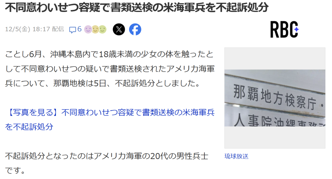 最近日媒报道又报道了一起案例,冲绳那霸检察厅宣布不起诉猥亵未成年女孩的美军,理由是有必要保护“涉案人员的名誉和隐私”。