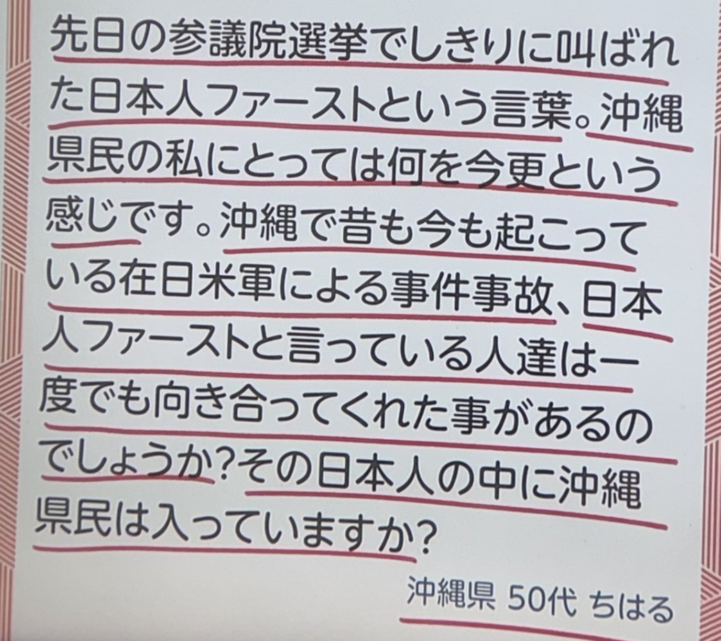 “参议院选举现场一直打着日本人优先的口号,在身为冲绳人的我看来,这种话尤其讽刺。