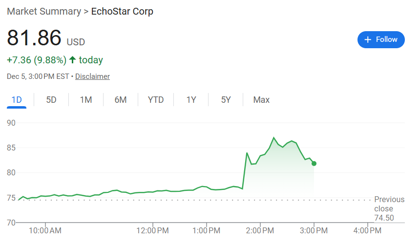 受相关消息及业务合作推动,与SpaceX达成频谱交易的EchoStar股价一度大涨18%,随后涨幅收窄至10%。
