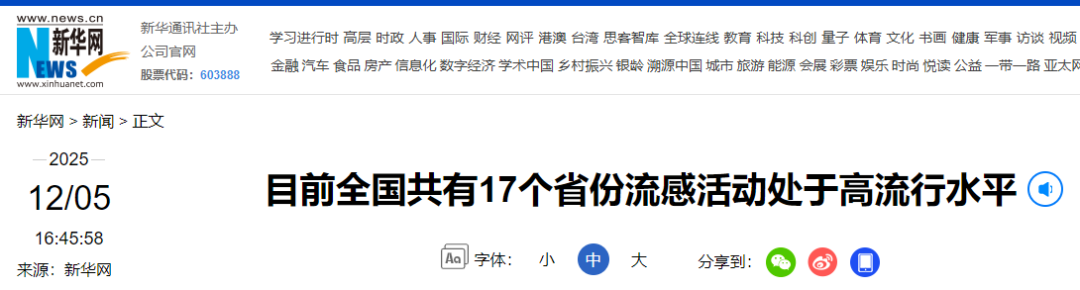 华山医院感染科副主任王新宇在接受媒体采访时表示,近期送检病例中流感阳性比例持续上升,儿童与青少年患者的阳性率更高,不过总体门急诊量与往年相当,说明目前仍处于季节性流行范围。中国疾控中心病毒病所研究员王大燕在12月5日的国家卫健委发布会上介绍,全国已有17个省份处于较高流行水平,其他省份处于中等流行水平。