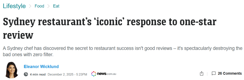 “我怎么做饭,就怎么回评论:直接、真实、不加味精。”她说,“现在悉尼餐饮业的人都被差评吓得不敢吱声,我不打算玩这个游戏。”