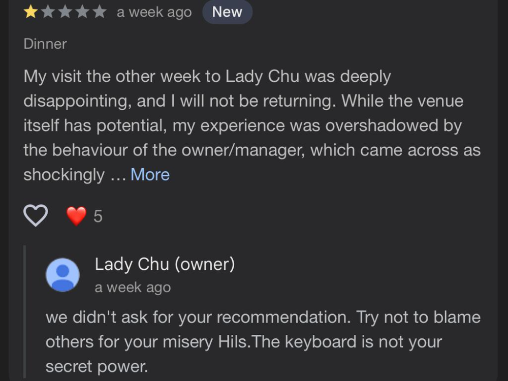 这家位于Potts Point的餐厅,因为老板Nahji Chu回复差评时毫不嘴软、火力全开的风格而在网络上爆红。