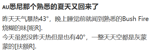 这两天,不少华人在社交平台发帖称,悉尼持续高温,不仅天空灰蒙,烟雾弥漫,还总能闻到一股烧糊的怪味道。