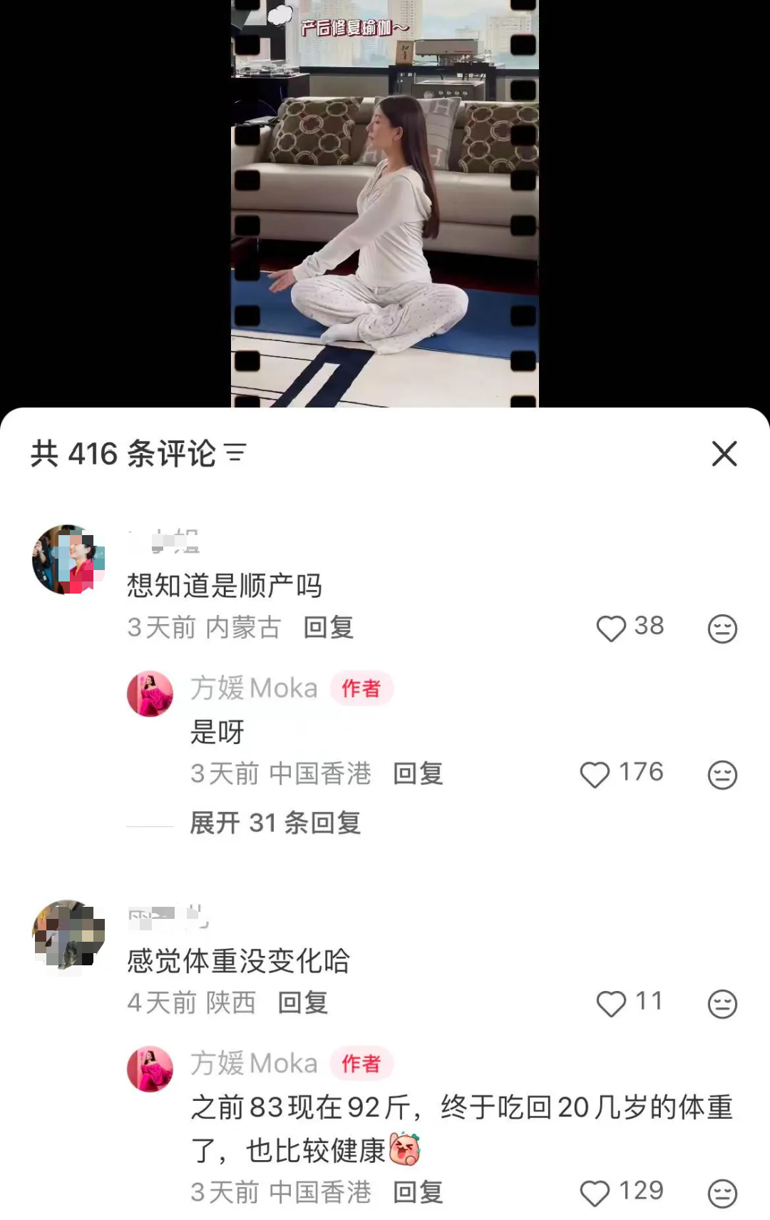 近日,方媛在社交平台分享动态,回复粉丝评论表示自己三胎是顺产,方媛自曝目前体重92斤,终于吃回年轻时的体重,感觉现在比较健康。