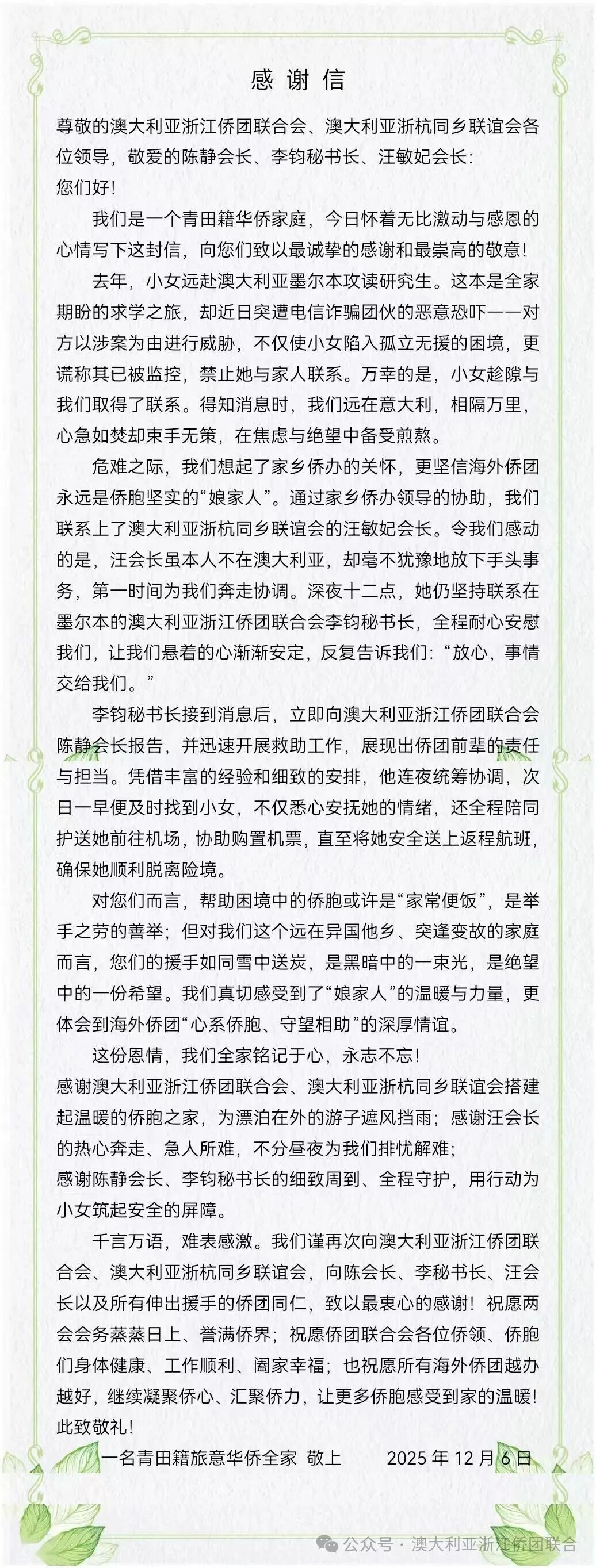 等女孩平安归家后,家人也写来长长的感谢信,对澳大利亚浙江侨团联合会表示感谢。