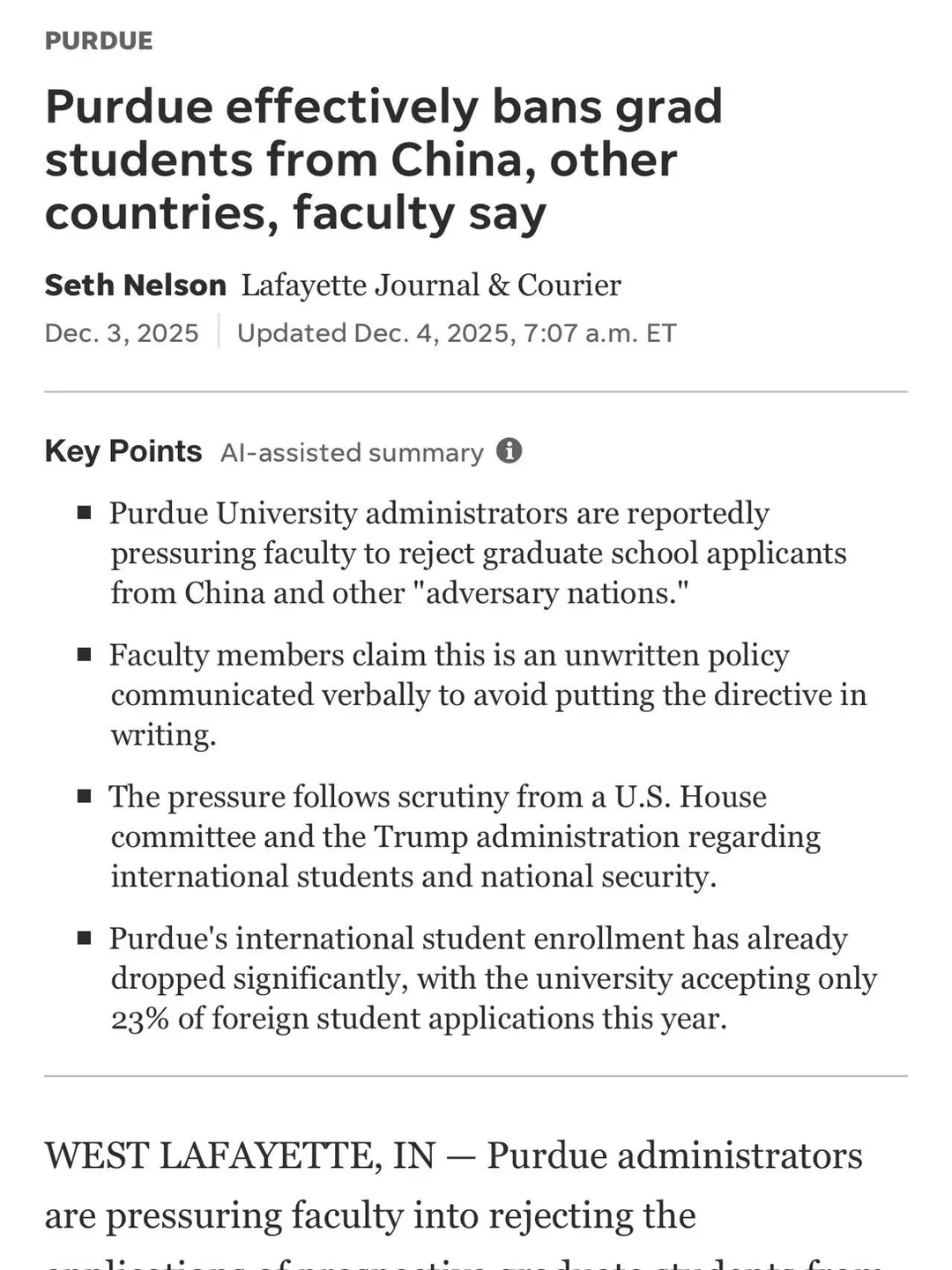 6月份,普渡大学正式通过了一项针对上诉“敌对国家”的政策,禁止教职员工与这些国家建立财务和招生层面的机构联系。虽然这项公开政策并没有明确禁止招收个体学生,但目前的内部压力表明,执行层面已扩大化。