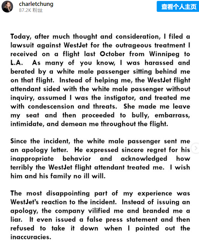 近日,一位华裔演员Charlet Chung在Instagram账号上发布了一则对西捷航空的诉讼,她称去年在一次飞行过程中,一名机组人员对她进行了“欺凌、羞辱、恐吓和贬低”等行为。