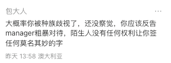 “大概率你被种族歧视了,还没察觉,你应该反告manager经理粗暴对待,陌生人没有任何权利让你签任何莫名其妙的字。”