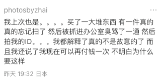 “我上次也是……买了一大堆东西,有一件真的真的忘记扫了,然后被抓进办公室臭骂了一通,然后拍我的ID……我都解释了真的不是故意的了,而且我还说我现在可以再付钱一次,不明白为什么要这样。”