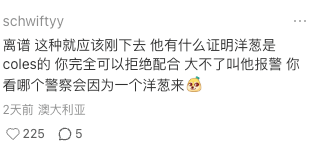 “离谱!这种就应该刚下去。他有什么证明洋葱是Coles的?你完全可以拒绝配合,大不了叫他报警,你看哪个警察会因为一个洋葱来。”