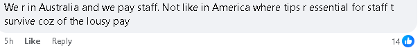 我们在澳洲,我们会给员工发工资。不像美国,因为工资低,小费对员工来说至关重要。