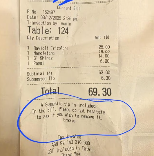 一位顾客在社交媒体曝光:自己在一家热门悉尼餐厅用餐,拿到账单时发现,在消费小计下面,竟然自动加上了 10% 的“建议小费”,并且已经被算进总金额里。