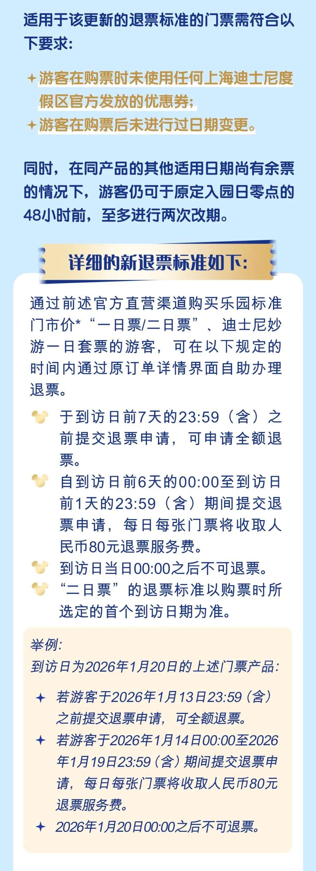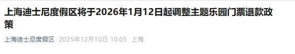 上海迪士尼度假区官方微信号12月10日宣布,将于2026年1月12日起优化上海迪士尼乐园门票退改政策。