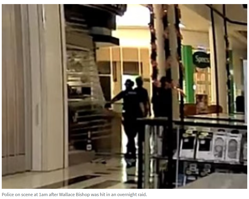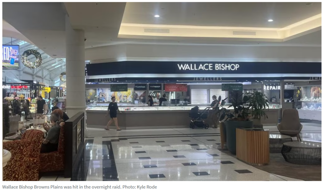 周三午夜,四名男子闯入Browns Plains购物中心的卸货区,随后使用工具砸碎Wallace Bishop珠宝店的大门,进入店内破坏存放珠宝的玻璃柜。