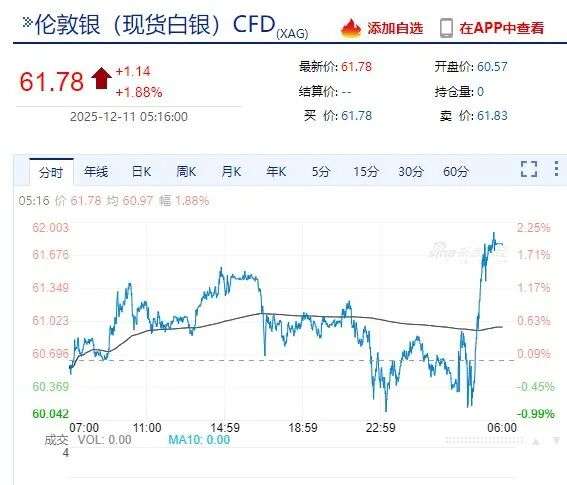 现货白银日内涨幅近2%,报61.78美元/盎司,再创历史新高。