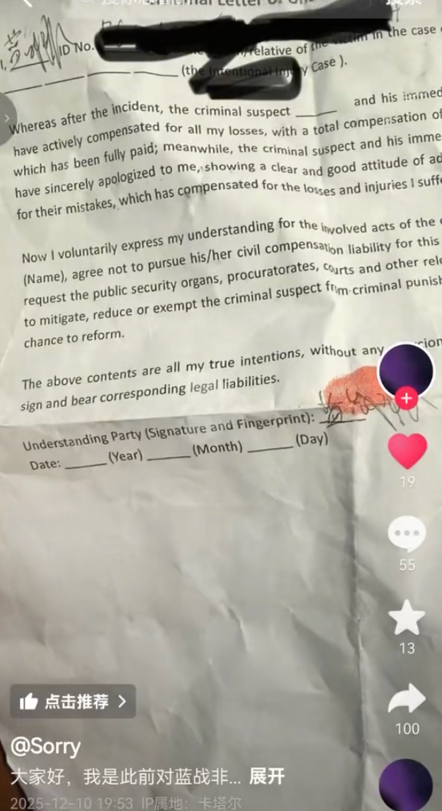 钱到账后,他为了自保拍了蓝战非身份证和护照等,并让对方签了一份谅解书。
