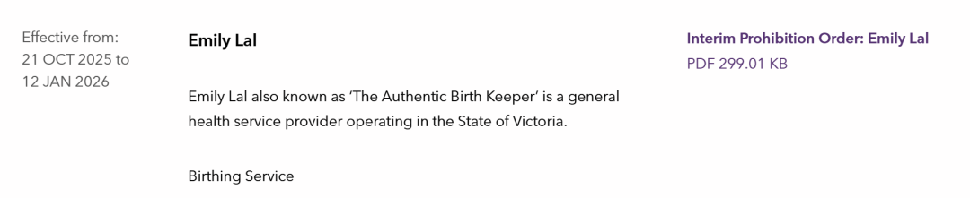 在Stacey去世后,维州卫生投诉专员发布了公开警告,并禁止Lal在维多利亚州提供任何形式的普通健康服务。