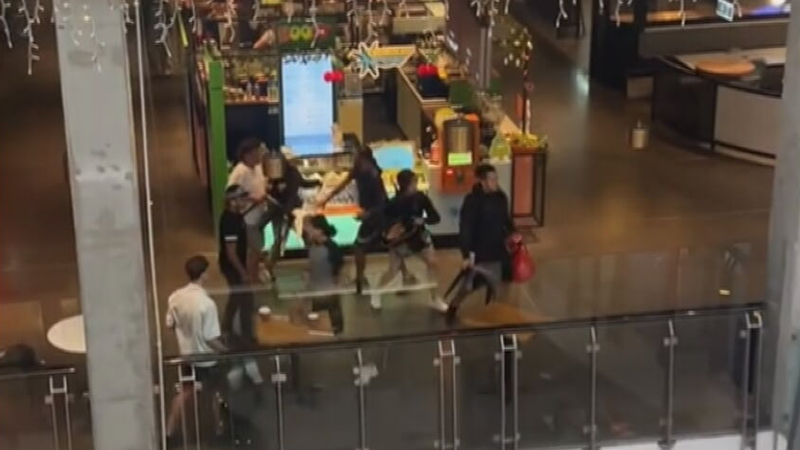 现场画面显示,这群青少年先是互相扔椅子,随后甚至将目标转向了随机路过的购物者。有人险些被砸到。
