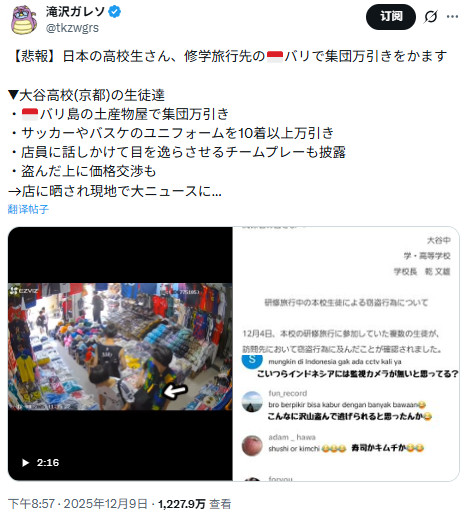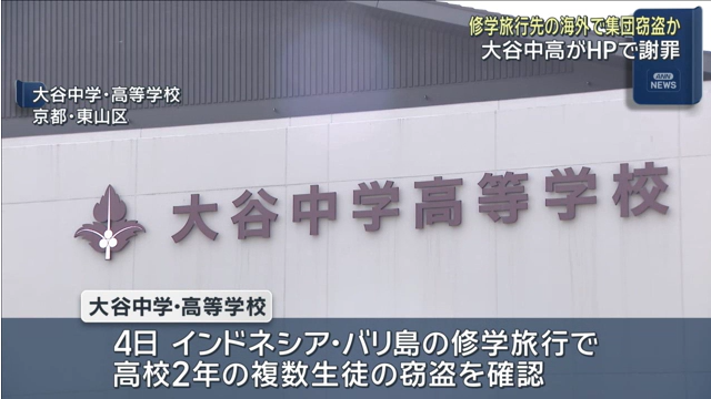而这次的新闻就发生在一所位于京都市东山区的大谷高中修学旅行期间,该学校的学生在印度尼西亚的旅游胜地巴厘岛旅行期间,被监控录像拍摄到了集体盗窃行为。