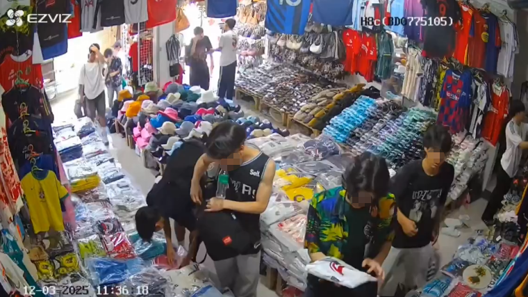 店员模样的男子离开后,少年们开始窥探动静。右侧的少年拿起一件 T 恤衫,又放回去,然后看了看店员的方向,迅速将它塞进了挎包里。少年们似乎在相互确认 T 恤衫上印着的“11 号”之类的号码,交谈着。
