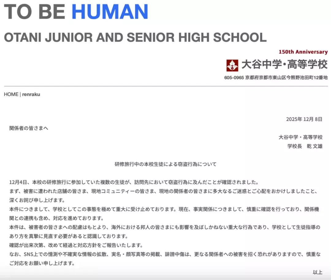 针对这次的风波,被点名的大谷中学·高等学校于 12 月 8 日傍晚,在其官方网站上发布了题为“关于本校学生在修学旅行期间的盗窃行为”的说明文,向网友作出解释。