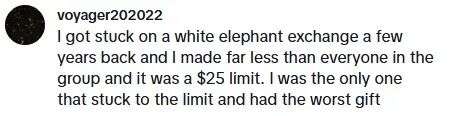 几年前,我也被困在一次白象游戏中,我的收入远低于小组中的每个人,而且限额为 25 美元。我是唯一一个坚持限额的人,然后得到的礼物最差。