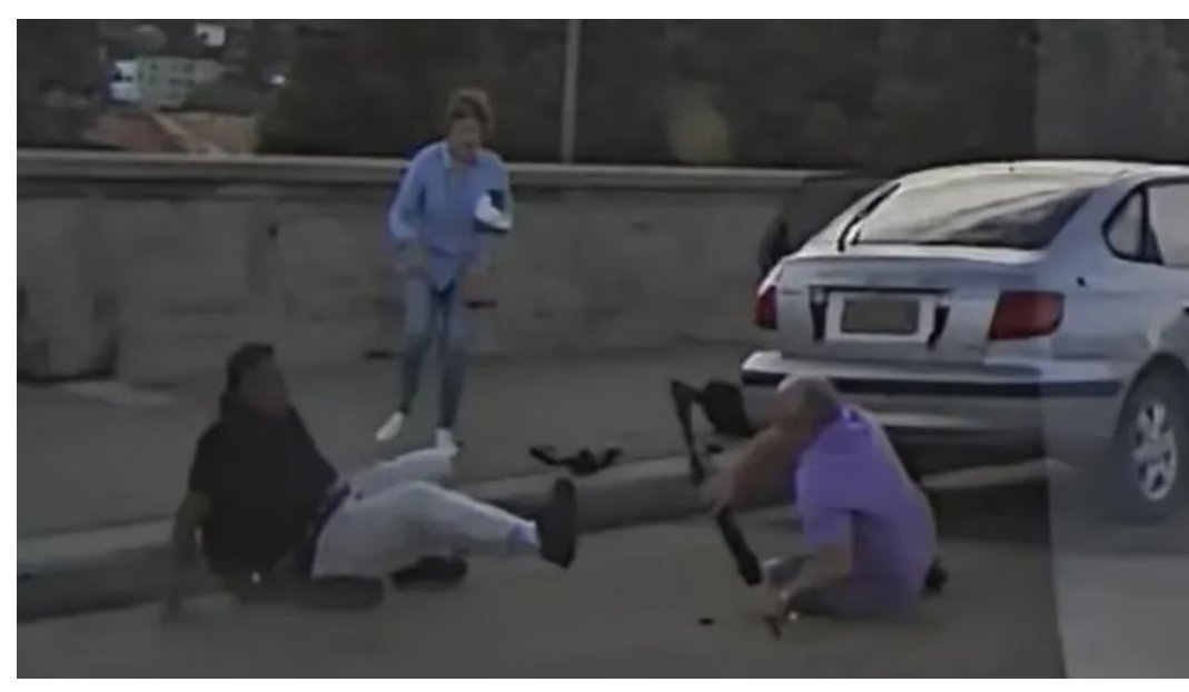 其中穿着紫色衬衫的老年男子赤手空拳冲过去,在搏斗中一度解除了他的武装。两人重重摔倒在路面上。
