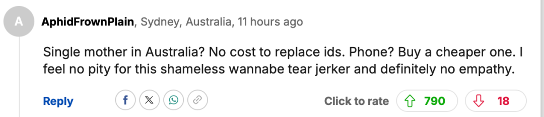 “澳大利亚的单身母亲?补办身份证是免费的。手机?买个便宜点的就行了。我对这个厚颜无耻、想博取同情的家伙没有丝毫怜悯,也绝对没有丝毫同情心。”