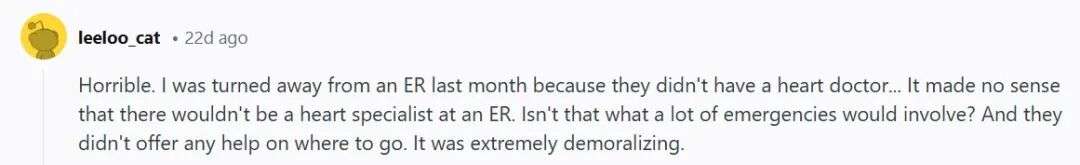 “这太糟了。上个月我去急诊时也被拒之门外,因为他们没有心脏科医生……急诊室居然没有心脏科医生?这简直匪夷所思。很多急症不都和心脏有关吗?而且他们也没告诉我应该去哪,真的太让人心寒了。”
