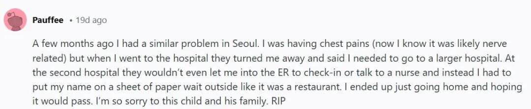 “几个月前,我在首尔也遇到过类似情况。当时我感觉胸痛(现在知道很可能和神经有关),可去医院时却被拒收,他们让我去更大的医院。等到了第二家医院,他们甚至不让我进急诊室挂号或是和护士说话,而是像在餐馆排队一样,让我把名字写在一张纸上,在外面等候。最后我只能回家,希望症状能自行缓解。对这个孩子和他的家人深表哀悼,愿他安息。”