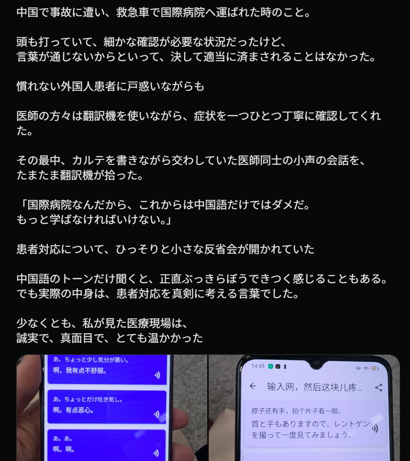 文章开头这位日本博主的经历之所以能引发如此大的共鸣,或许正是因为它打破了很多人对“中国”“外国人”“医疗现场”的刻板印象。