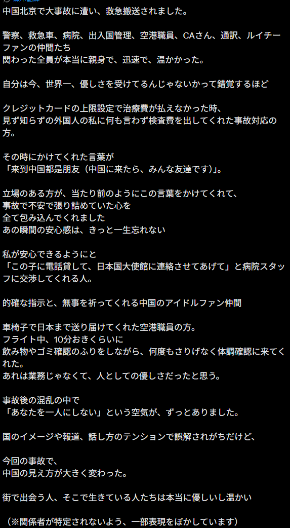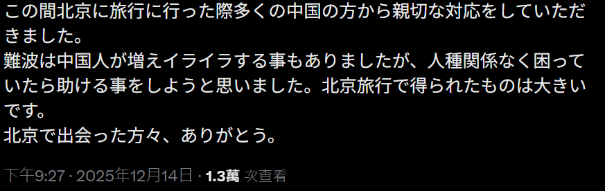 “前阵子去北京旅行时,得到了很多中国人的热心帮助。虽然在大阪难波因为中国游客增多,有时也会感到烦躁,但我想,不分种族,只要看到有人遇到困难,就应该去帮助他们。这次北京之行让我收获很大。在北京遇到的各位,谢谢你们。”