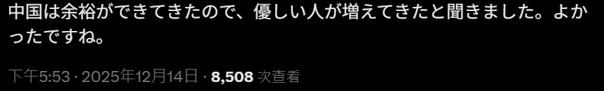 “听说中国现在渐渐有了余裕,所以善良、友好的人也越来越多了。真是太好了呢。”