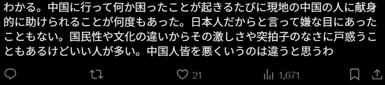 “我懂。每次去中国,只要遇到什么困难,都会一次又一次地得到当地中国人非常尽心尽力的帮助。也从来没有因为我是日本人而遭遇过不愉快的对待。当然,因为国民性和文化差异,有时会对那种激烈的反应方式或出其不意的行为感到困惑,但好人真的很多。把所有中国人都说成坏人,我觉得是不对的。”
