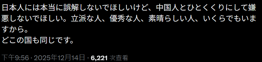 “真的希望日本人不要产生误解,也不要把中国人一概而论、抱着厌恶的情绪。了不起的人、优秀的人、非常棒的人,多得是。任何国家都是一样的。”