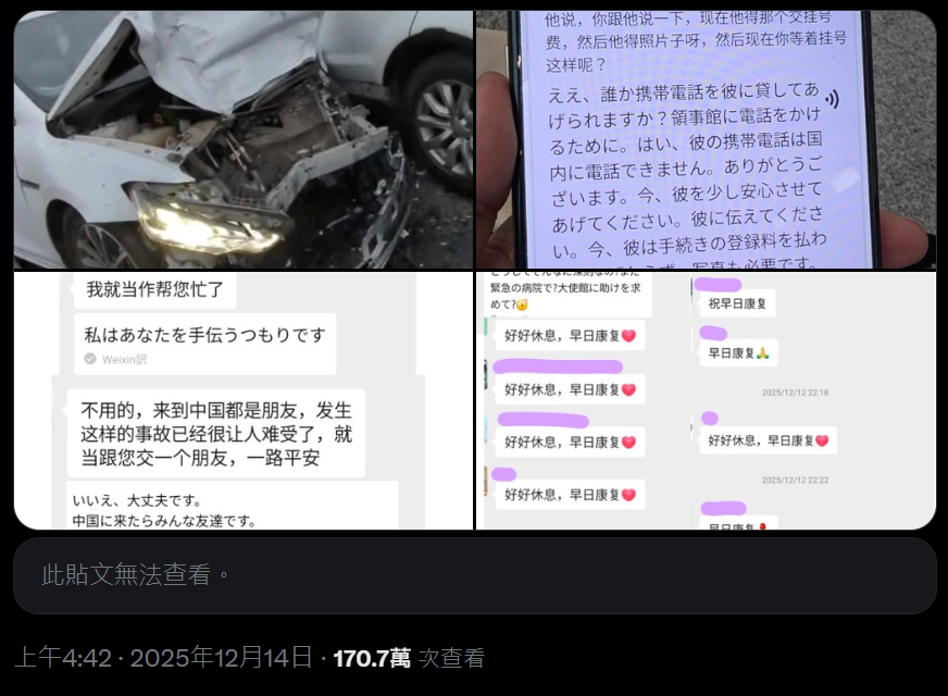 12月14日,一位日本妹子在X上发文,称自己在北京出差时遭遇车祸,后被紧急送往医院,并详细描述了自己遭遇车祸后经历的一系列事情,获得了170多万的浏览量。