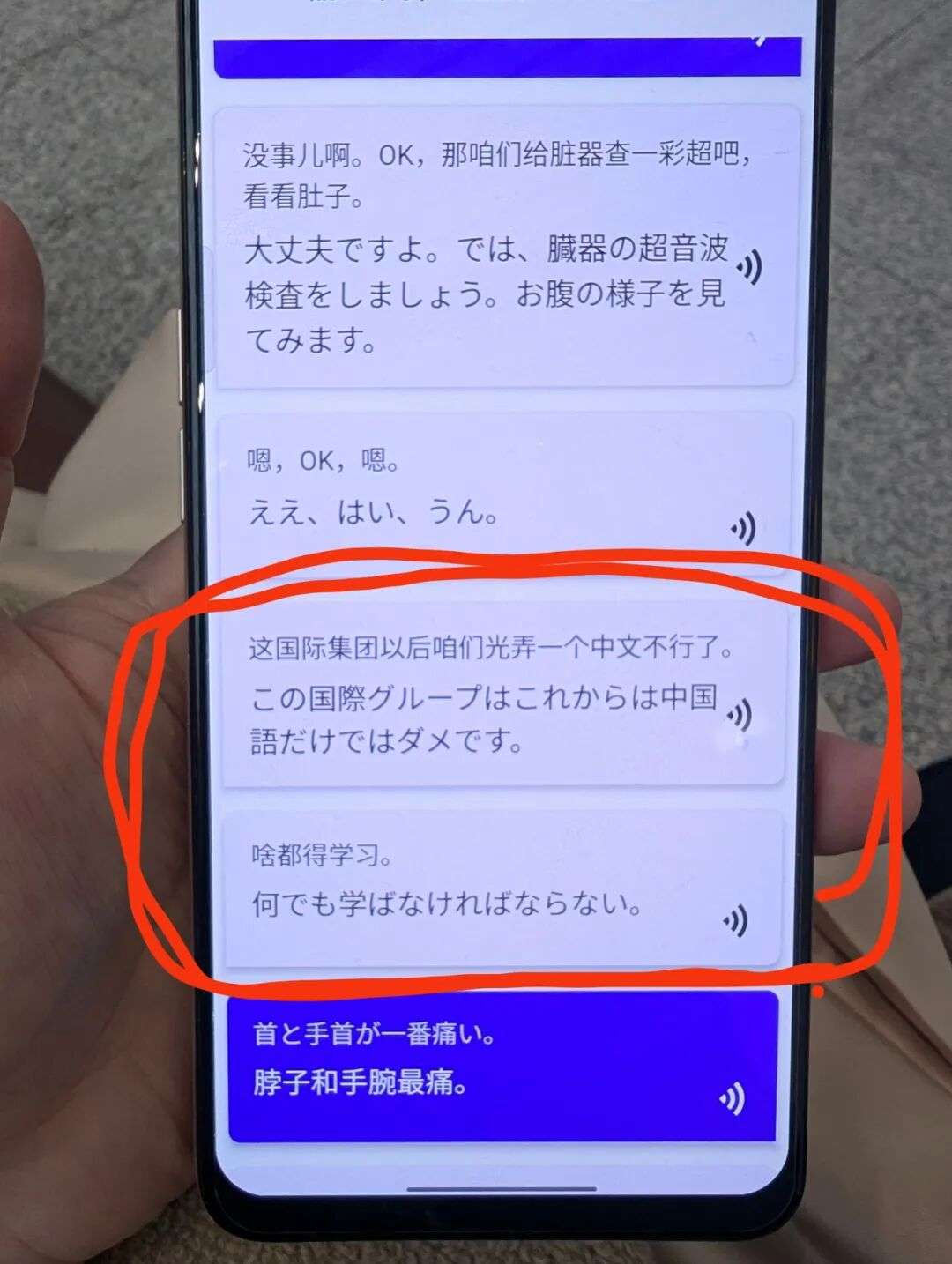就在这个过程中,翻译机恰好捕捉到了医生们一边填写病历、一边低声交谈的内容:'既然是国际医院,今后就不能只会中文了。我们还得学得更多。'