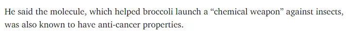 研究人员指出,这种分子帮助西兰花“发射”的这种对抗昆虫的“化学武器”异硫氰酸盐,不仅能降低血栓的风险,同时也被认为具有抗癌特性。