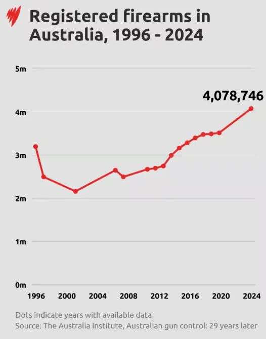 澳大利亚研究所今年 1 月发布的一份报告显示,澳大利亚民间持有的枪支数量已超过 400 万支,较 1996 年亚瑟港惨案发生前增长了 25%。