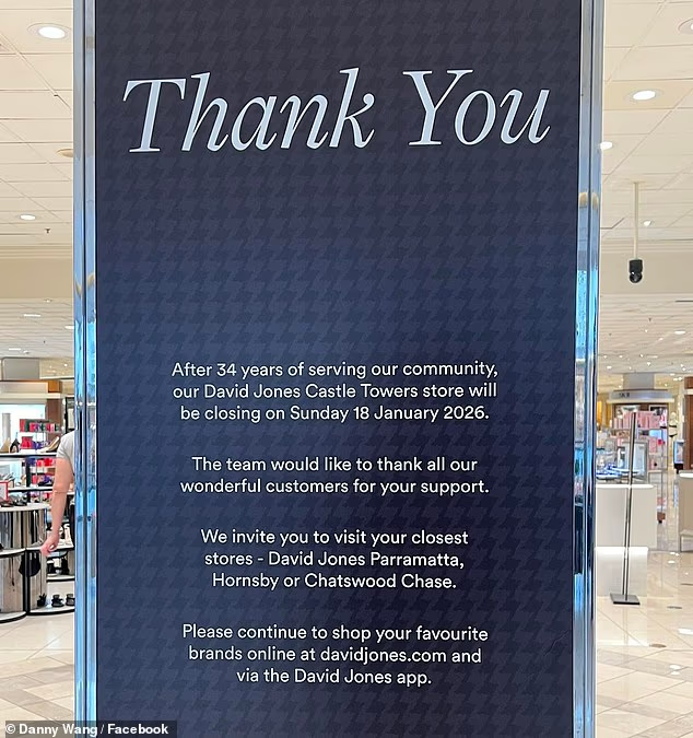 告示上写道:“在为社区服务34年后,David Jones Castle Towers 门店将正式关闭。感谢所有顾客长期以来的支持。”