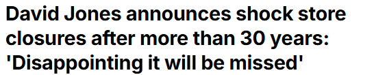 关店声明中,David Jones 向当地顾客表达感谢,称“将永远珍惜过去30年的支持与陪伴”。然而,再温情的告别,也无法掩盖现实的冷峻。