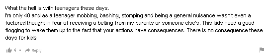 我才40岁,我自己当年当青少年的时候,成群结队闹事、打人、踩人、到处添乱这种事,想都不敢想。因为很清楚,不管是回家被爸妈揍,还是被别人家大人教训,后果都很严重。