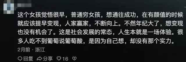 说公屏上劝她的人是“吃不到葡萄说葡萄酸,在有颜值的时候就应该提早变现,不断向上,不然年纪大了,想变现也没有机会了”。