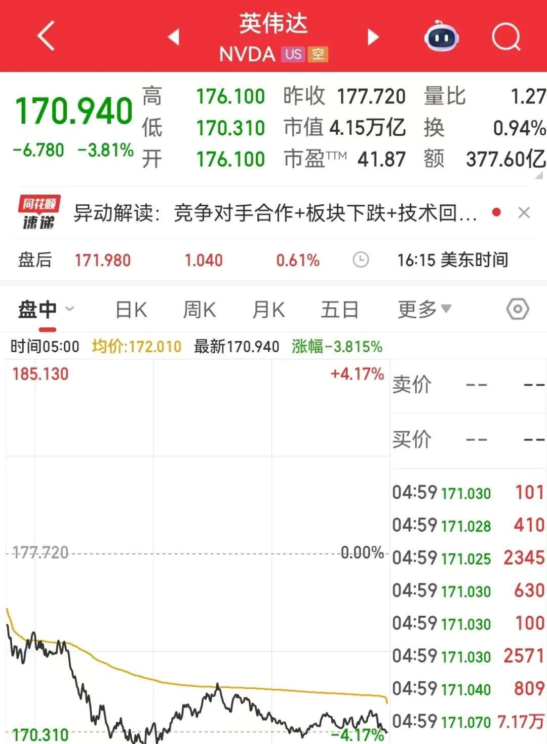英伟达报170.94美元,跌3.81%,市值一夜蒸发1648亿美元(约合人民币11608亿元)。