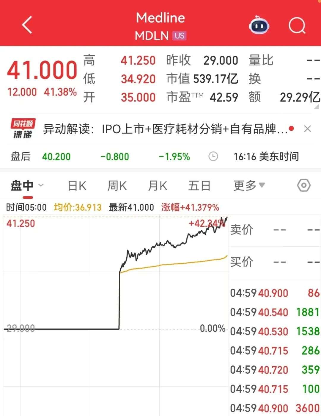 2025年最大规模IPO:Medline Inc.(MDLN)美国IPO首日涨41.38%,报41美元,此前给出的IPO发行价为29美元,融资62.6亿美元。
